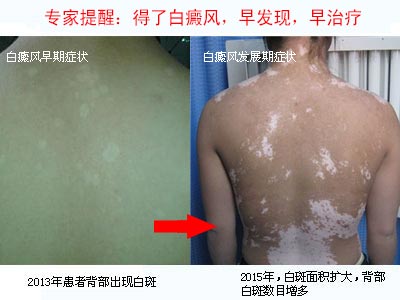 医生提醒广大患者:白癜风是一种皮肤顽症,一旦得了白癜风,如果确诊后背上的白斑是白癜风的话,一定要及早治疗。白斑病程越长黑色素脱失越严重,白斑逐渐扩散(如下图)。白癜风早期无论是在治疗效果,还是康复难度上都是要大大低于白斑扩散之后的。白癜风长期发展会在一定程度上降低患者自身的免疫力,不利于后期治疗。而且有时白癜风的扩散还会引起不必要的并发症,这比白癜风本身更具危害性。