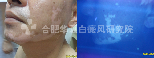 (初诊时,患者面部白斑症状在Wood灯下可见)