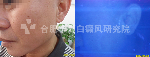 ▲病史:两个月前面部因暴晒后出现白斑,曾在当地县城医院治疗过,外用(具体药物不详),为求进一步治疗,特来我院就诊。